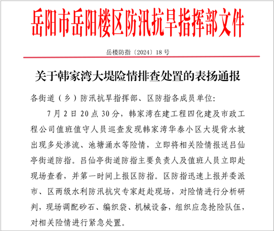 7月5日,岳陽市委常委、常務副市長李建華到項目現場督導防汛工作,對公司前段防汛工作給予充分肯定。同日,岳陽市岳陽樓區防汛抗旱指揮部發來通報,對項目部精心組織、及時處置,確保管涌險情得到有效控制予以表揚,并對喻希陽予以嘉獎。