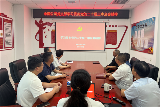 近日,中南公司黨支部召開理論學習會,傳達學習黨的二十屆三中全會精神。會議強調,要深刻領會和把握進一步全面深化改革的主題、重大原則、重大舉措、根本保證,把學習貫徹全會精神與做好當前重點工作結合起來,堅持目標導向、問題導向,以釘釘子精神抓好重大改革任務貫徹落實,在公司高質量發展進程中勇當先行者、譜寫新篇章、作出新貢獻。