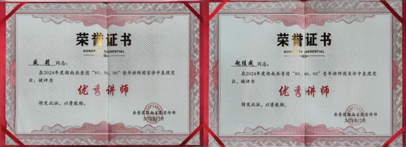 近日,共青團(tuán)湖南省委召開(kāi)“理 XIANG 青年”新時(shí)代湖湘青年理論學(xué)習(xí)年度示范宣講會(huì)。會(huì)上,公司青年盛莉、趙佳成榮獲“湖南省2024年度優(yōu)秀講師”稱號(hào)。