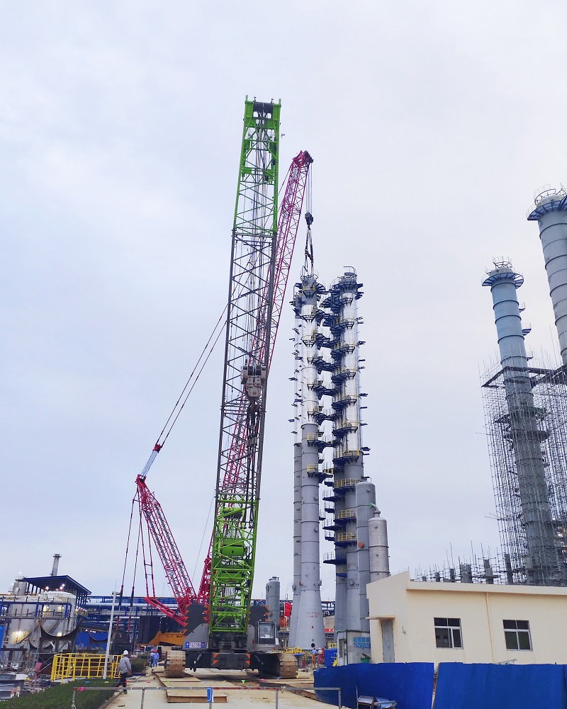 該項目大件設備共兩臺T-602A/B),設備單重均為150噸。為順利完成此次吊裝任務,項目部采用高強度大規格鋼絲繩,在確認鋼絲繩額定負載和所有鋼絲繩完好情況下,現場多次進行起重低空試運行,確保一切正常后方正式起吊。在吊裝中,項目施工人員采用400噸和650噸兩臺履帶起重機,順利將大件設備吊裝就位,如期完成施工階段第一個關鍵節點,獲得業主、監理的一致贊譽。通訊員 孫善義)