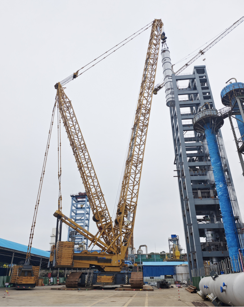 作為華強(qiáng)化工尿素生產(chǎn)線的“心臟”設(shè)備與整個(gè)升級(jí)改造工程的核心樞紐,此次吊裝的尿素合成塔高27.5米、直徑3米,其安裝精度直接關(guān)乎裝置投用后的運(yùn)行效能。為了確保一次順利將這臺(tái)核心設(shè)備吊裝成功,項(xiàng)目部前期反復(fù)論證、優(yōu)化專項(xiàng)方案,最終確定采用“雙機(jī)抬吊”工藝:以1250噸履帶吊為主吊設(shè)備,搭配900噸汽車吊協(xié)同溜尾作業(yè),精準(zhǔn)匹配設(shè)備重量與現(xiàn)場工況。同時(shí),項(xiàng)目部始終將“安全第一”貫穿全程,吊裝前嚴(yán)格開展吊索具全面檢查,科學(xué)劃定警戒區(qū)域,明確各崗位操作規(guī)范,全程實(shí)時(shí)監(jiān)控吊裝姿態(tài)與受力情況,最終實(shí)現(xiàn)設(shè)備“零誤差”精準(zhǔn)落位,整個(gè)作業(yè)安全高效、一氣呵成。